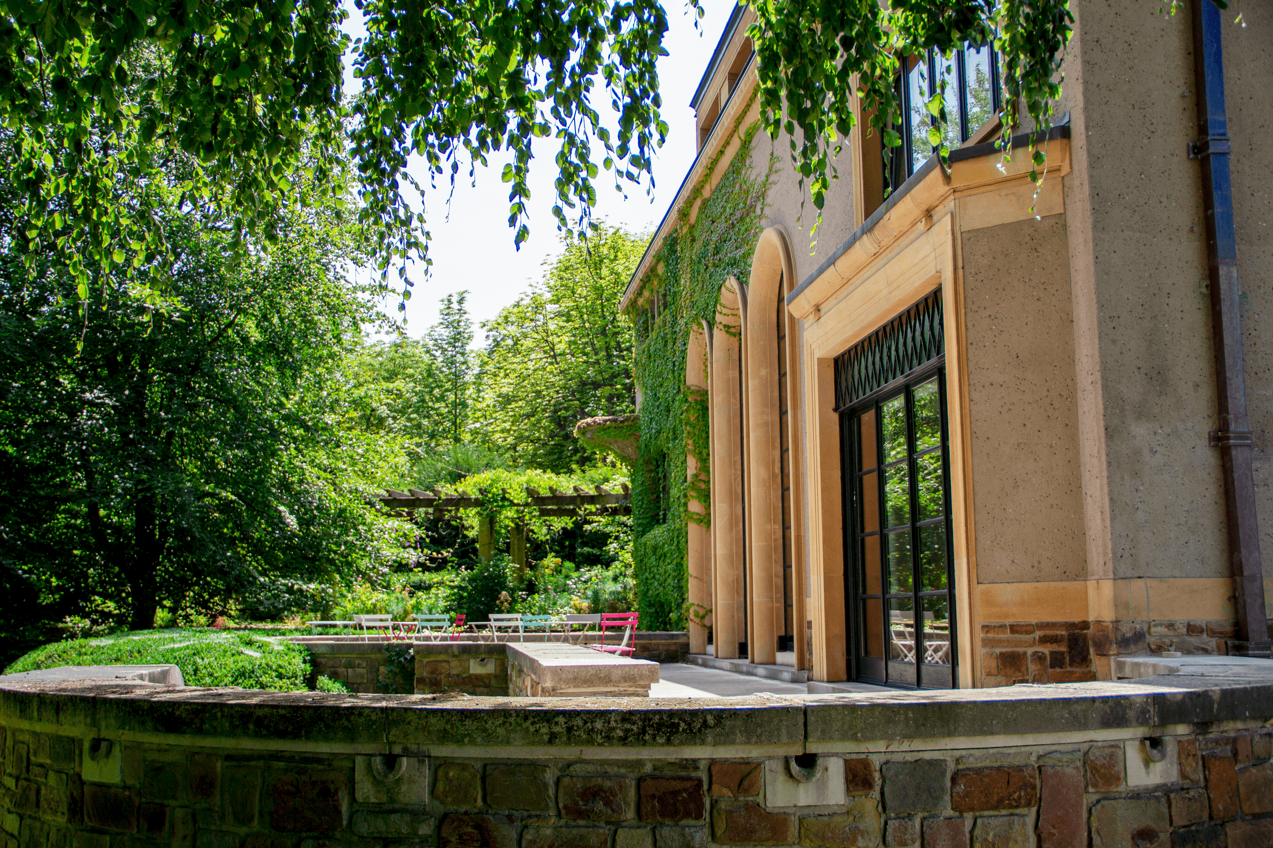 Ses grandes baies vitrées baignent l'ensemble de lumière naturelle et s'ouvrent sur un jardin paysager d’exception, conçu par Jules Buyssens, architecte en chef des parcs et jardins de la Ville de Bruxelles pendant plus de trente ans.