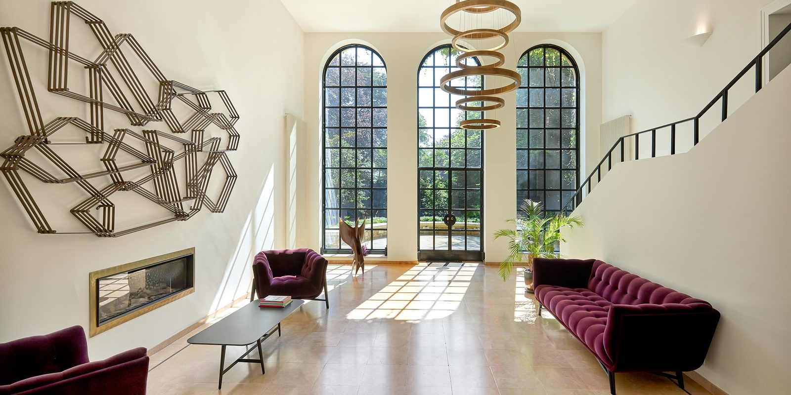 L'intérieur a été magnifiquement rénové dans le respect de l'âme de la grande demeure bourgeoise des années 30 : ferronnerie d'origine des portes, parquets de style Versailles et détails architecturaux soigneusement préservés cohabitent avec des œuvres d'art contemporaines. Les salles de réunion prolongent cette élégance avec leurs grandes tables en marbre — un cadre chic et historique qui donne une tout autre dimension à vos rencontres professionnelles.