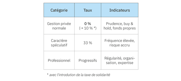Actuellement, les plus-values issues de la gestion normale d’un patrimoine privé ne sont pas taxées. Ce régime s’applique lorsque l’investisseur adopte un comportement prudent, non spéculatif et sans lien avec une activité professionnelle. Parmi les critères généralement retenus par l’administration fiscale figurent : un nombre limité d’opérations, une stratégie de long terme (buy & hold), l’absence de recours à l’emprunt, un investissement proportionné par rapport au patrimoine total ainsi qu’une absence d’expertise particulière ou d’activité dans le secteur des crypto-actifs.