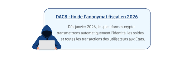 DAC8 oblige, à partir de  janvier 2026, les plateformes de cryptomonnaies (telles que Binance, Coinbase ou Kraken) à transmettre automatiquement aux autorités fiscales du pays où elles sont établies les informations suivantes: